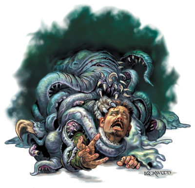 Cloakers usually lie still, watching and listening for prey. If facing a single opponent, a cloaker uses its engulf attack. Against multiple foes, it lashes with its tail in concert with its moan and shadow shift abilities to reduce the opposition’s numbers, then engulfs a survivor. Multiple cloakers usually split up, leaving one or two behind to use special abilities while the rest make melee attacks.