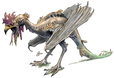 A cockatrice fiercely attacks anything that it deems a threat to itself or its lair. Flocks of cockatrices do their utmost to overwhelm and confuse their foes, and sometimes fly directly into their opponents’ faces.