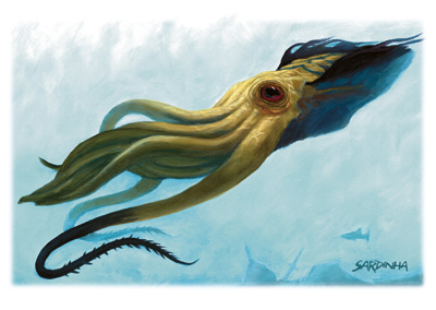 Six of the beast’s tentacles are shorter arms about 30 feet long; the remaining two are nearly 60 feet long and covered with barbs. Its beaklike mouth is located where the tentacles meet the lower portion of its body.